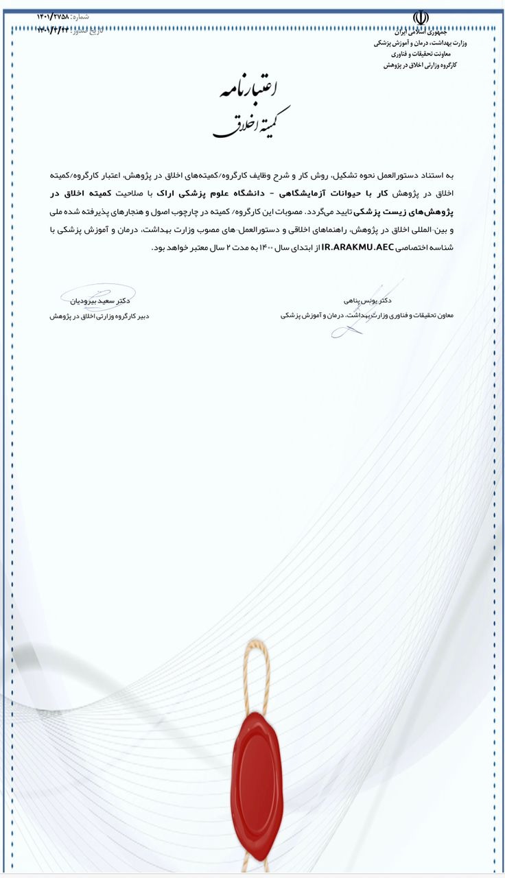 اخذ اعتبار نامه کمیته اخلاق در پژوهش کار با حیوانات آزمایشگاهی برای دانشگاه علوم پزشکی اراک ۰۱ تیر ۱۴۰۱ | ۰۷:۲۲ کد : ۲۷۲۴۶ اطلاعیه ارسال به دیگران نام شما ایمیل شما ایمیل دریافتکننده ارسال انصراف تعداد بازدید:۱۸۵۰۰