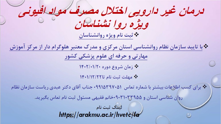 برگزاری دوره آموزشی و مهارتی اختلال مصرف مواد افیونی ویژه روان شناسان ۱۵ اسفند ۱۴۰۱ | ۰۸:۴۰ کد : ۳۲۸۶۷ اطلاعیه ارسال به دیگران نام شما ایمیل شما ایمیل دریافتکننده ارسال انصراف تعداد بازدید:۲۱۱۷۹ لینک ثبت نام