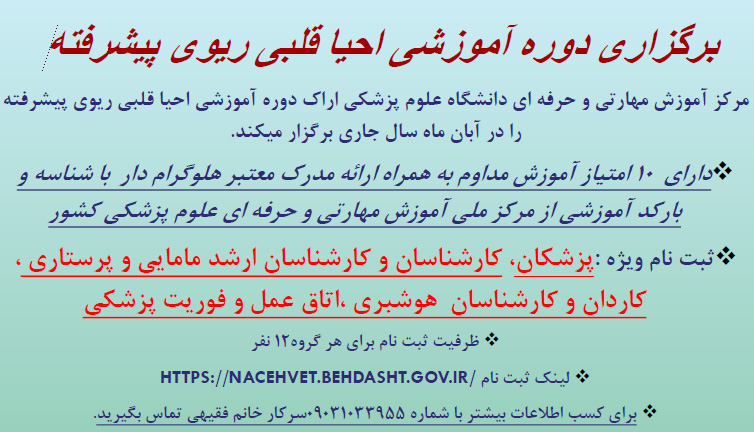 اطلاعیه برگزاری دوره آموزشی احیا قلبی ریوی پیشرفته ۰۸ مهر ۱۴۰۲ | ۱۰:۲۰ کد : ۳۷۹۸۷ اطلاعیه ارسال به دیگران نام شما ایمیل شما ایمیل دریافتکننده ارسال انصراف تعداد بازدید:۱۸۰۳۲