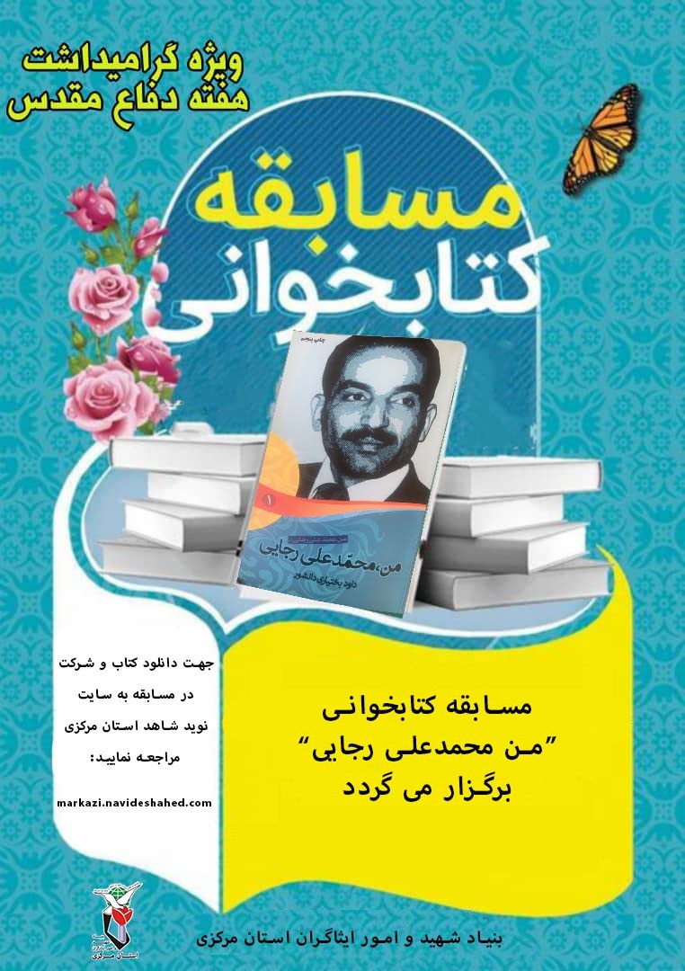 بنیاد شهید و امور ایثارگران استان مرکزی به مناسبت چهل و چهارمین سالگرد هفته دفاع مقدس ، مسابقه ای از کتاب " من ، محمد علی رجایی " از مجموعه کتاب های شهدای دولت ، به صورت مجازی در سایت نوید شاهد به شرح ذیل برگزار می نماید.