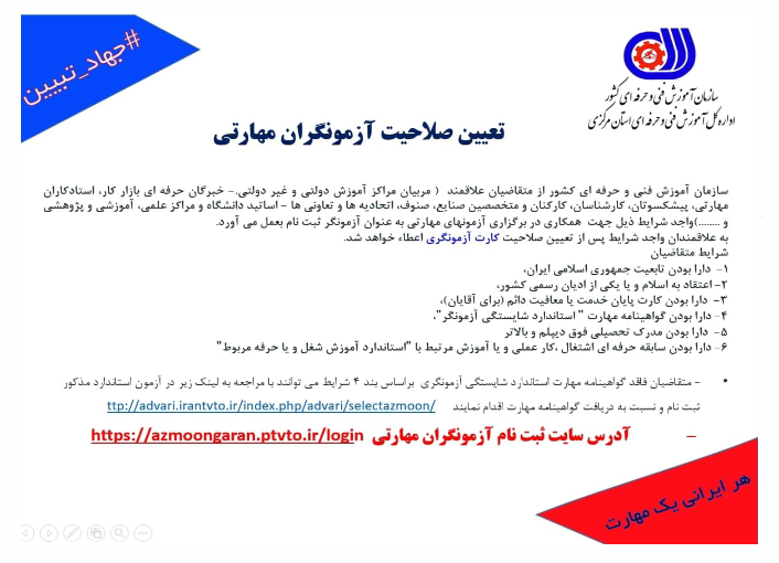 اداره کل آموزش فنی و حرفه ای استان مرکزی در راستای ارائه آموزش های مهارتی طرح " سه شنبه های مهارتی " را برگزار می نماید.