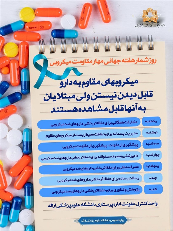 کلیدواژه‌ها: هفته پیام شعار هفته مهار مقاومت میکروبی دانشگاه علوم پزشکی اراک اداره پرستاری وزارت بهداشت مقاومت میکروبی آنتی بیوتیک مصرف خودسرانه آنتی بیوتیک عفونت بیمارستانی