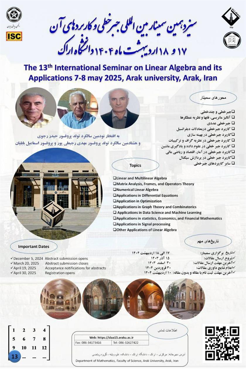 سیزدﻫﻤﯿﻦ ﺳﻤﯿﻨﺎر ﺟﺒﺮ خطی و کارﺑﺮدﻫﺎی آن در ﺗﺎرﯾﺦ 17و 18 اردﯾﺒﻬﺸﺖ ﻣﺎه ﺳﺎل 1404در دانشگاه اراک برگزار می گردد.