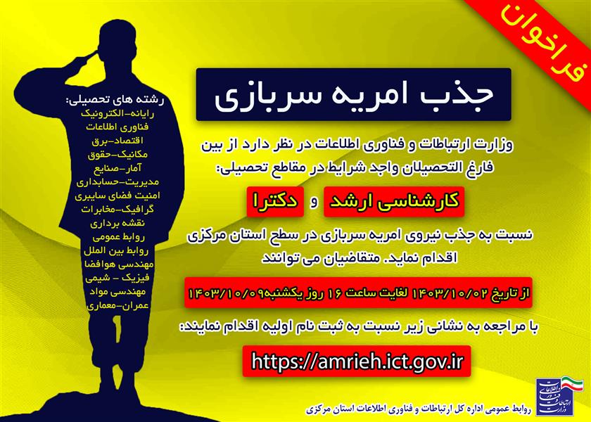وزارت ارتباطات و فناوری اطلاعات ، در نظر دارد از بین فارغ التحصیلان مقاطع کارشناسی ارشد و دکتری در رشته های فناوری اطلاعات، حقوق، اقتصاد، رایانه، مدیریت، حسابداری، مکانیک، آمار، مخابرات، صنایع، گرافیک، عمران، برق، روابط عمومی، روابط بین الملل، مهندسی هوافضا، فیزیک، شیمی، مهندسی مواد، معماری و امنیت فضای سایبری در سطح استان مرکزی نسبت به جذب نیروی امریه سربازی (به منظور خدمت در مرکز استان) اقدام نماید.