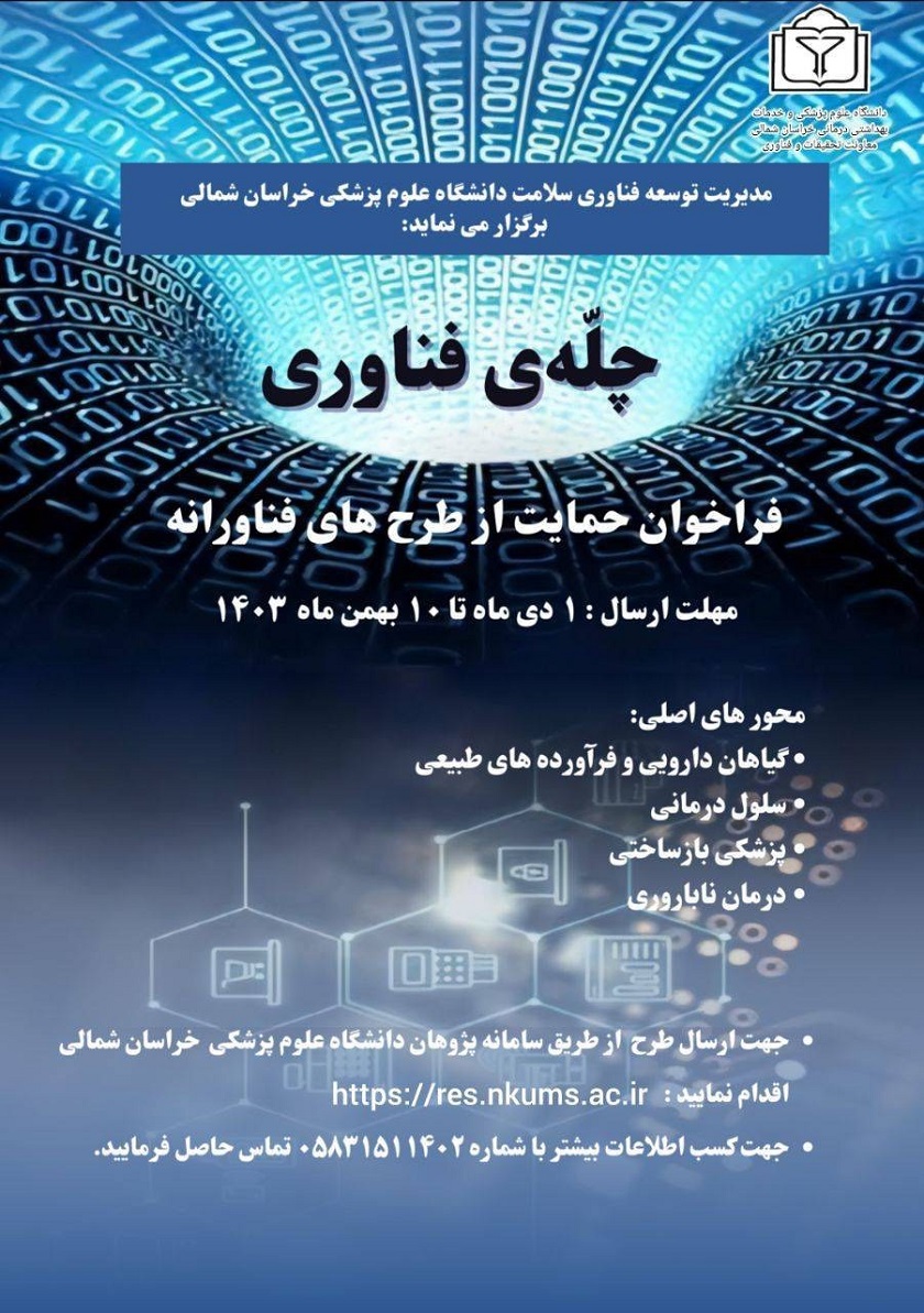 به اطلاع اعضای هیات علمی می رساند معاون تحقیقات و فناوری دانشگاه علوم پزشکی خراسان شمالی در نظر دارد از ایده های نوآورانه و فناورانه سلامت محور، ذیل طرح «چلّه ی فناوری» حمایت نماید. شایان ذکر است در عناوین پیشنهادی از طرف همکاران هر دانشگاه، حضور یکی از اعضای هیئت علمی دانشگاه علوم پزشکی خراسان شمالی به عنوان مجری الزامی است.