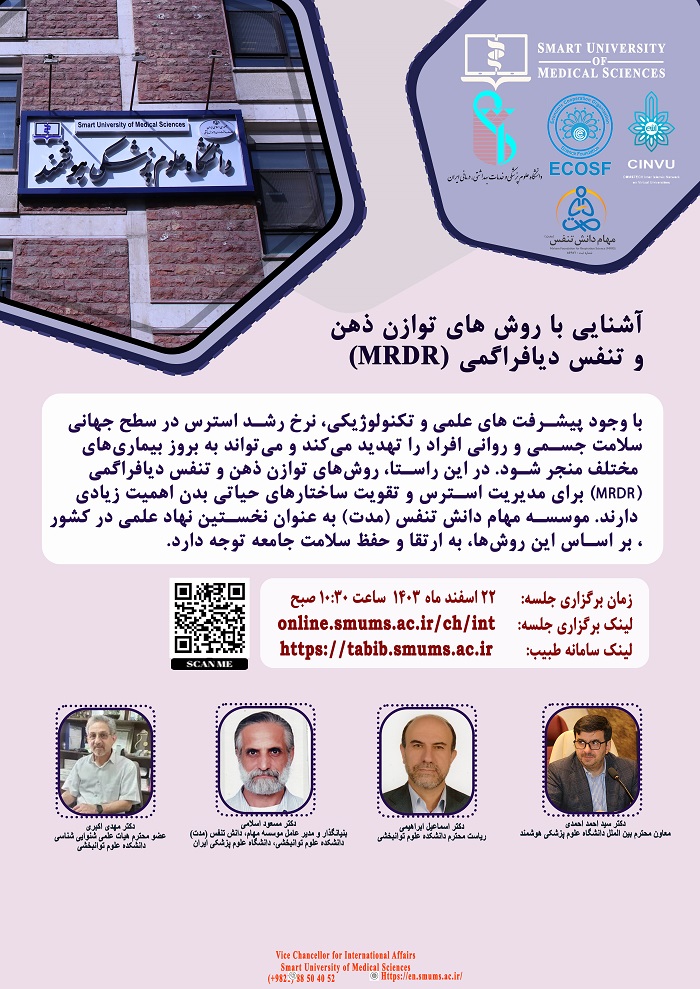 به اطلاع اساتید، دانشجویان و افراد علاقمند می رساند دانشگاه علوم پزشکی هوشمند در نظر دارد، وبینار  بین المللی " Introduction to Mind Balance Techniques " با سخنرانی جناب آقای دکتر مسعود اسلامی، جناب آقای دکتر اسماعیل ابراهیمی، ریاست دانشکده علوم توانبخشی، دانشگاه علوم پزشکی ایران و جناب آقای دکتر مهدی اکبری، عضو هیات علمی شنوایی سنجی دانشکده علوم توانبخشی دانشگاه علوم پزشکی ایران، به زبان انگلیسی، روز چهارشنبه مورخ ۱۴۰۳٫۱۲٫۲۲ از ساعت ۱۰:۳۰ لغایت ۱۲:۳۰ به صورت آنلاین  برگزار نماید.