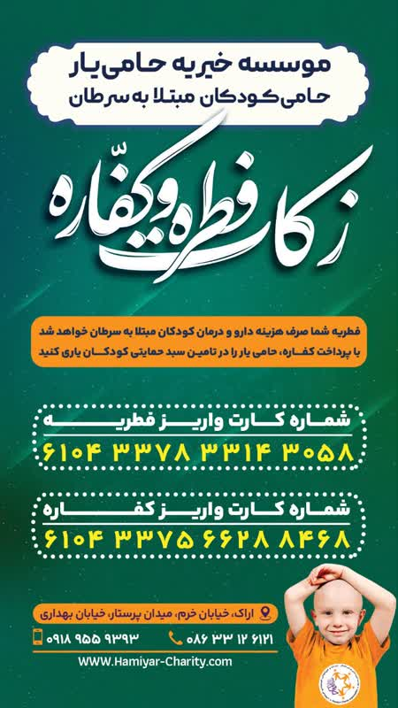 موسسه خیریه حامی یار، حامی کودکان مبتلا به سرطان به عنوان اولین و تنها تشکل ملی استان مرکزی در نظر دارد به مناسبت فرارسیدن عید سعید فطر با هدف ترویج فرهنگ انسان دوستانه نسبت به جمع آوری فطریه و نذورات مردمی در راستای حمایت از کودکان مبتلا به سرطان اقدام می نماید. این کمک ها صرف هزینه ی دارو و درمان کودکان مبتلا به سرطان خواهد شد.