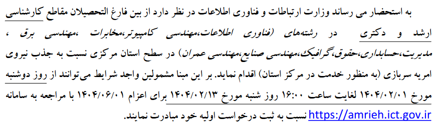 چهارمین مرحله جذب نیروی امریه سربازی در وزارت ارتباطات و فناوری اطلاعات ۲۷ فروردین ۱۴۰۴ | ۱۵:۱۱ کد : ۵۰۸۰۸ اطلاعیه ارسال به دیگران نام شما ایمیل شما ایمیل دریافتکننده ارسال انصراف تعداد بازدید:۵۱۷۸ فراخوان چهارمین مرحله جذب نیروی امریه سربازی در وزارت ارتباطات و فناوری اطلاعات