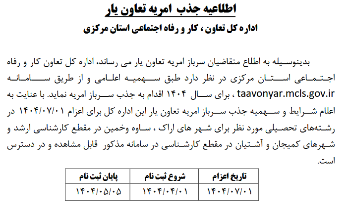 اطلاعیه جذب امریه تعاون یار ۱۱ تیر ۱۴۰۴ | ۱۲:۰۴ کد : ۵۲۷۴۸ اطلاعیه ارسال به دیگران نام شما ایمیل شما ایمیل دریافتکننده ارسال انصراف تعداد بازدید:۱۹۴۵ اطلاعیه جذب امریه تعاون یار