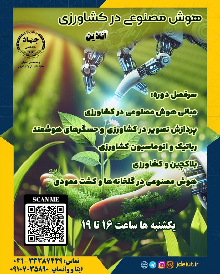 بنا بر اعلام معاونت آموزش و کارآفرینی جهاد دانشگاهی واحد صنعتی اصفهان، پیرو استقبال چشمگیر از دوره های تخصصی، کارگاه تخصصی " کاربرد هوش مصنوعی در کشاورزی هوشمند و دقیق " را با اهداف زیر برگزار می نماید.