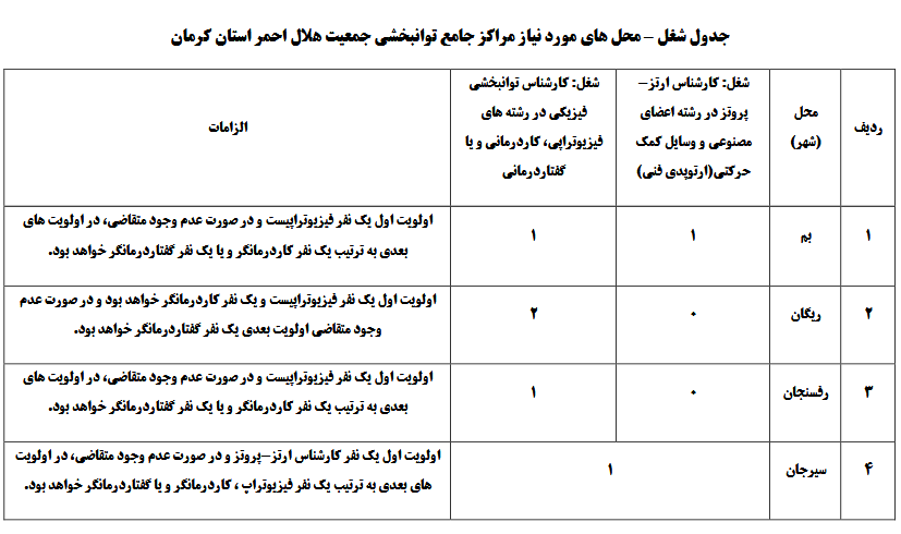 به اطلاع می رساند، جمعیت هلال احمر کشور به منظور تأمین نیروی انسانی تخصصی مورد نیاز مراکز توانبخشی فعال خود در سطح استان کرمان، اقدام به استخدام نیرو در رشته محل های مورد نیاز برای مشاغل ذکر شده در جدول ذیل می نماید.فایل متن فراخوان جذب کارشناسان توانبخشی به پیوست می باشد.