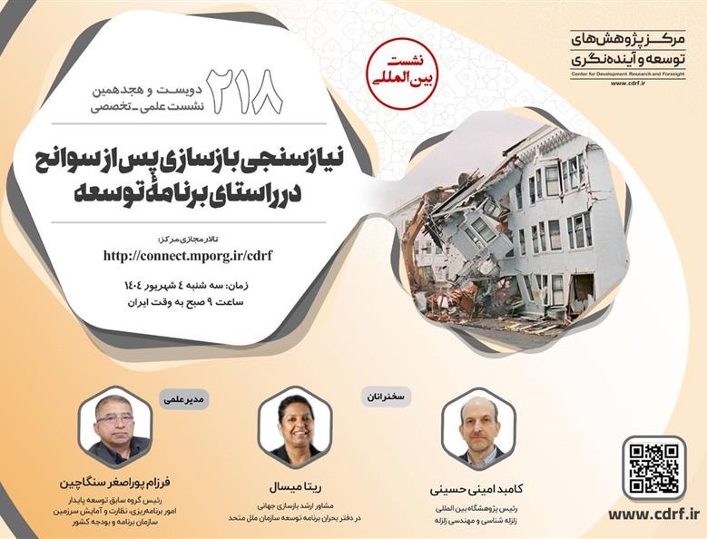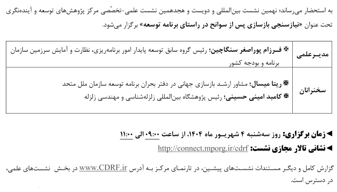 نشست علمی نیاز سنجی بازسازی سوانح در راستای برنامه توسعه ۰۳ شهریور ۱۴۰۴ | ۱۲:۳۷ کد : ۵۴۰۰۰ اطلاعیه ارسال به دیگران نام شما ایمیل شما ایمیل دریافتکننده ارسال انصراف تعداد بازدید:۲۴۸۱ نشست علمی نیاز سنجی بازسازی سوانح در راستای برنامه توسعه، توسط مرکز پژوهش های توسعه و آینده نگری برگزار می گردد.