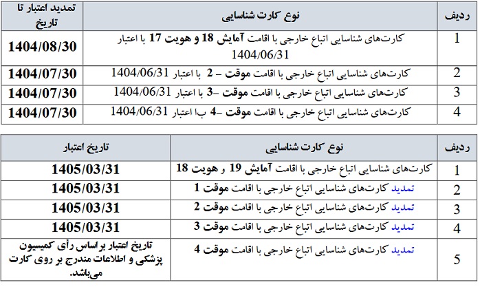 با توجه به تمدید اجرای طرح های به روزرسانی اطلاعات پناهندگان جمعی؛ با استناد به ابلاغیه های مشاور وزیر و رئیس مرکز امور اتباع و مهاجرین خارجی وزارت کشور ، اعتبار کارت های شناسایی اتباع خارجی و تداوم ارائه خدمات (بیمه، تحصیل، خدمات بانکی و ...) به این گروه از پناهندگان جمعی به شرح زیر دارای اعتبار می باشد.