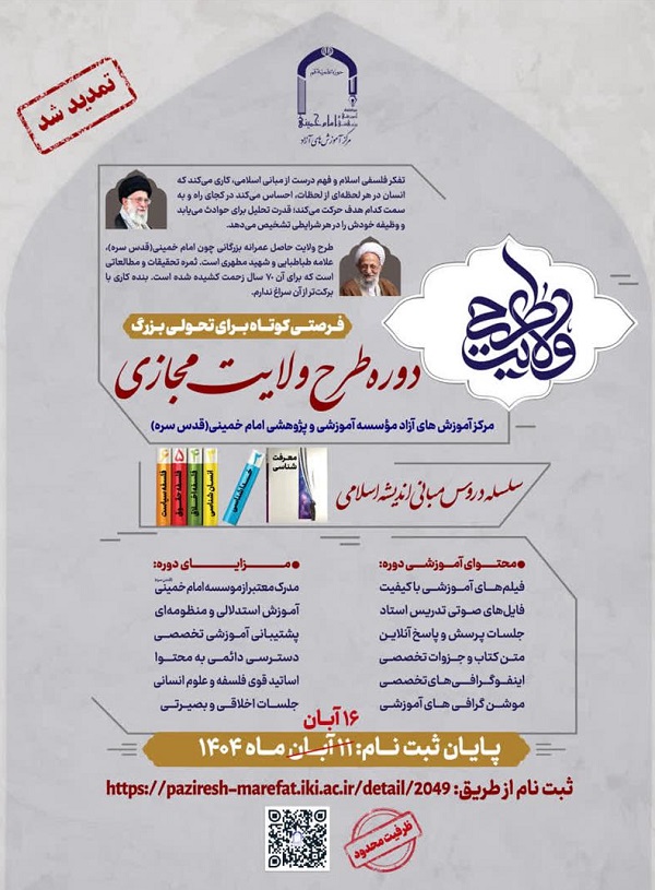 •    برای اطلاع از زمان دقیق آغاز و پایان ثبت نام به کانال مرکز آموزش های آزاد در ایتا و یا کانال طرح ولایت مجازی در بله مراجعه کنید.