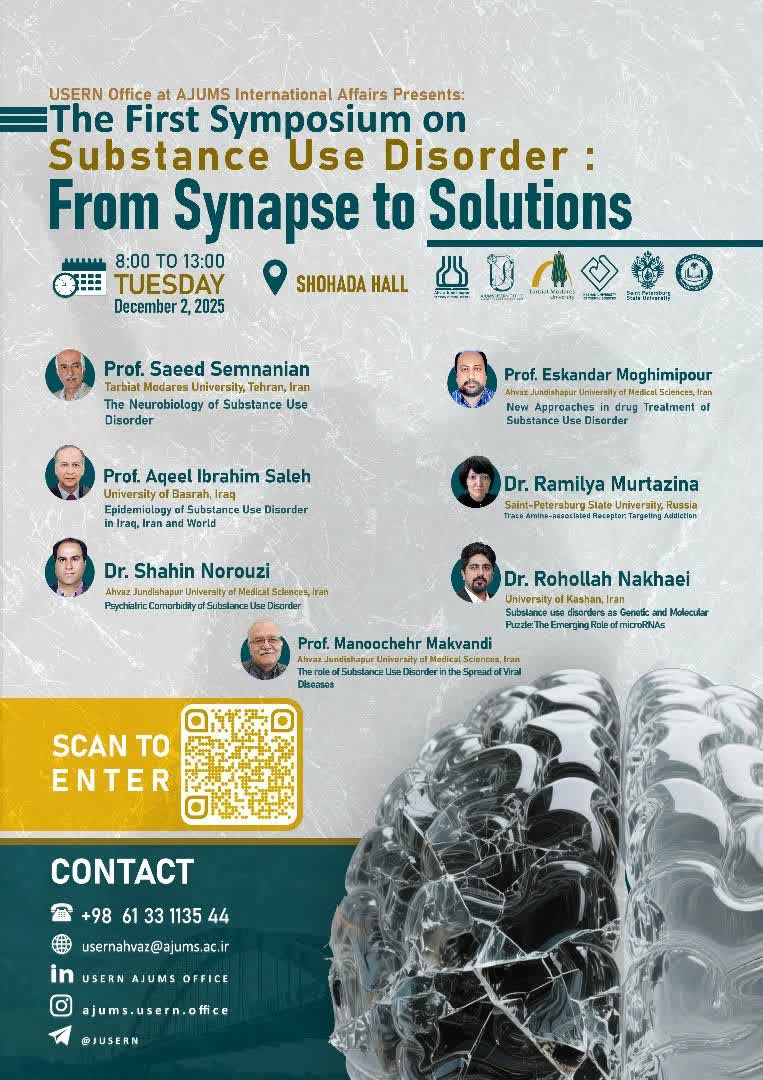 به اطلاع می رساند سمپوزیوم بین المللی با عنوان "Substance Use Disorders: From Synapses to Solutions" به صورت حضوری - مجازی، توسط مدیریت امور بین الملل دانشگاه علوم پزشکی جندی شاپور اهواز برگزار می گردد.