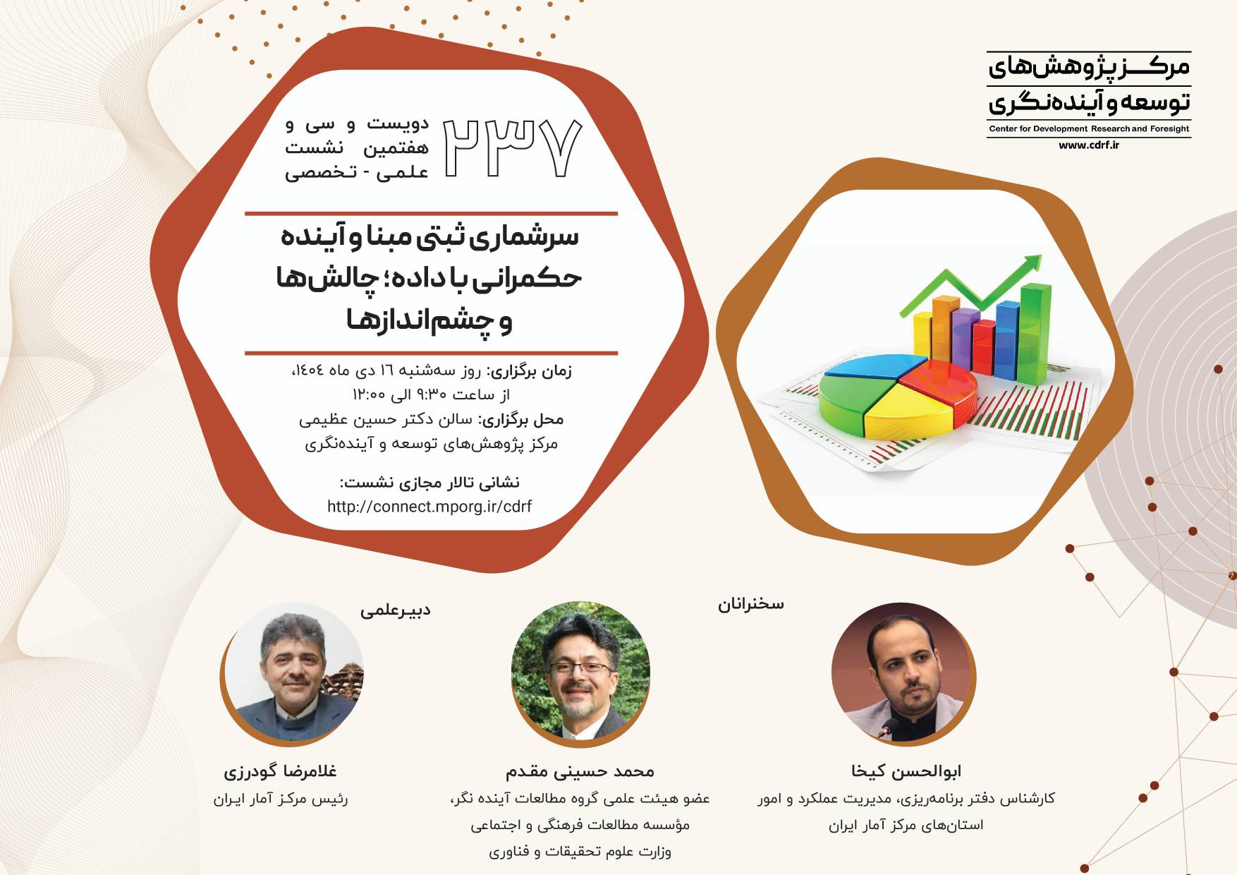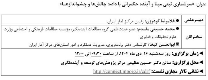 نشست علمی سرشماری ثبتی مبنا آینده حکمرانی با داده ۱۴ دی ۱۴۰۴ | ۱۰:۲۱ کد : ۵۷۴۱۸ اطلاعیه ارسال به دیگران نام شما ایمیل شما ایمیل دریافتکننده ارسال انصراف تعداد بازدید:۹۱۸ دویست وسی وهفتمین نشست علمی - تخصصی با عنوان سرشماری ثبتی مبنا آینده حکمرانی با داده، چالش ها وچشم اندازها