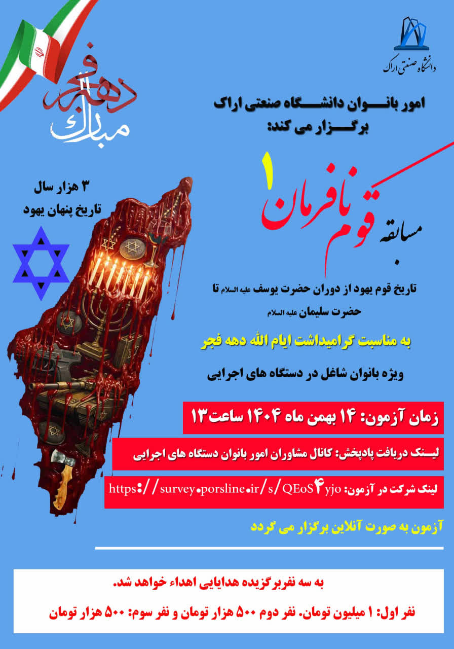 مسابقه قوم نافرمان ۰۸ بهمن ۱۴۰۴ | ۱۰:۳۹ کد : ۵۷۷۴۳ اطلاعیه ارسال به دیگران نام شما ایمیل شما ایمیل دریافتکننده ارسال انصراف تعداد بازدید:۶۷۱ برگزاری مسابقه قوم نافرمان، در ایام الله دهه فجر