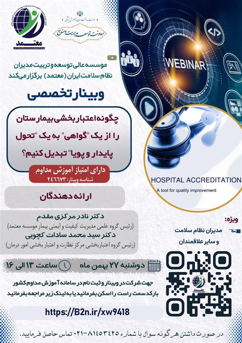 وبینار تخصصی "چگونه اعتباربخشی بیمارستان را از یک "گواهی" به یک "تحول پایدار و پویا" تبدیل کنیم؟ ۲۶ بهمن ۱۴۰۴ | ۱۲:۱۴ کد : ۵۸۰۱۱ اطلاعیه ارسال به دیگران نام شما ایمیل شما ایمیل دریافتکننده ارسال انصراف تعداد بازدید:۶۵۵ برگزاری وبینار تخصصی "چگونه اعتباربخشی بیمارستان را از یک " گواهی" به یک " تحول پایدار و پویا " تبدیل کنیم؟